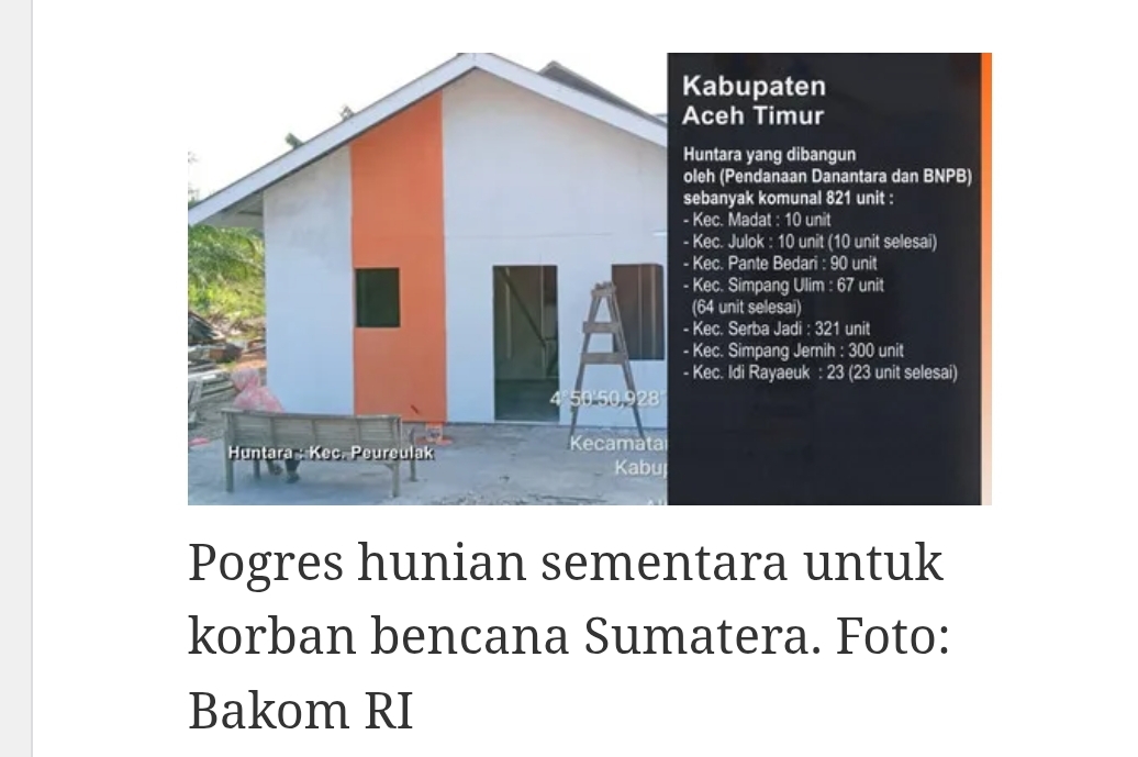Aceh – Suaraexpose.com, Badan Nasional Penanggulangan Bencana (BNPB) merilis perkembangan terkini pembangunan hunian sementara (huntara) bagi masyarakat terdampak bencana di Provinsi Aceh, Sumatra Utara, dan Sumatra Barat, Sabtu (24/1/2026).