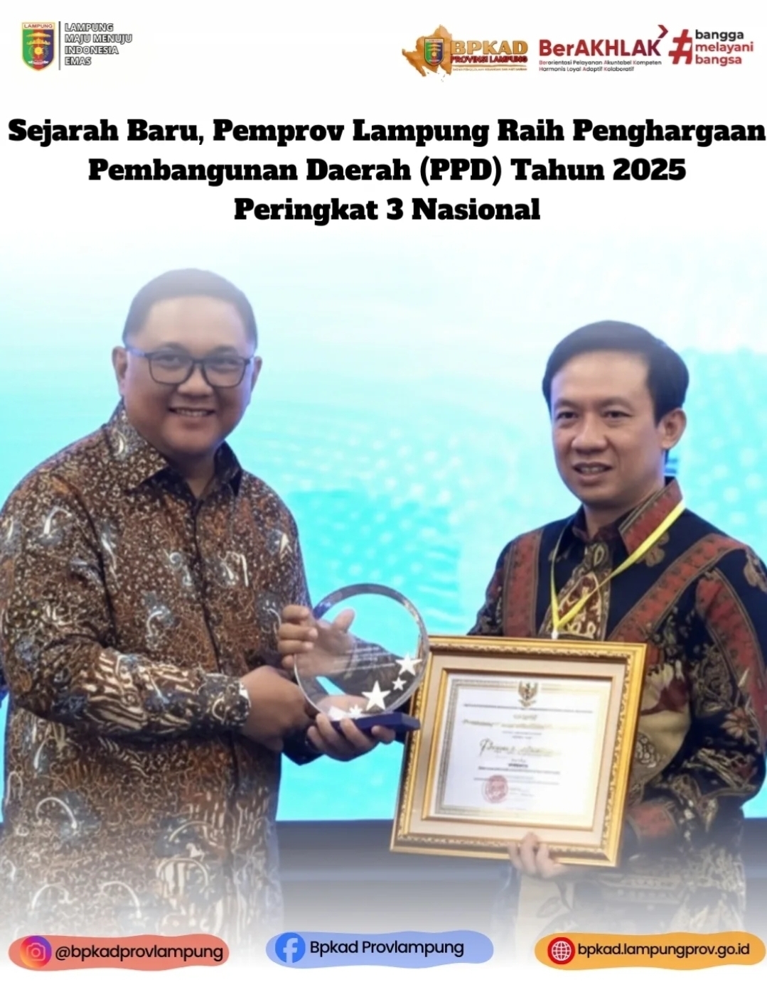 “Ini bukti bahwa kerja keras seluruh perangkat daerah dan partisipasi masyarakat tidak sia-sia. Kita bangun Lampung yang berbasis data, inovatif, dan benar-benar menyentuh rakyat kecil, tegas Gubernur dalam pidatonya.