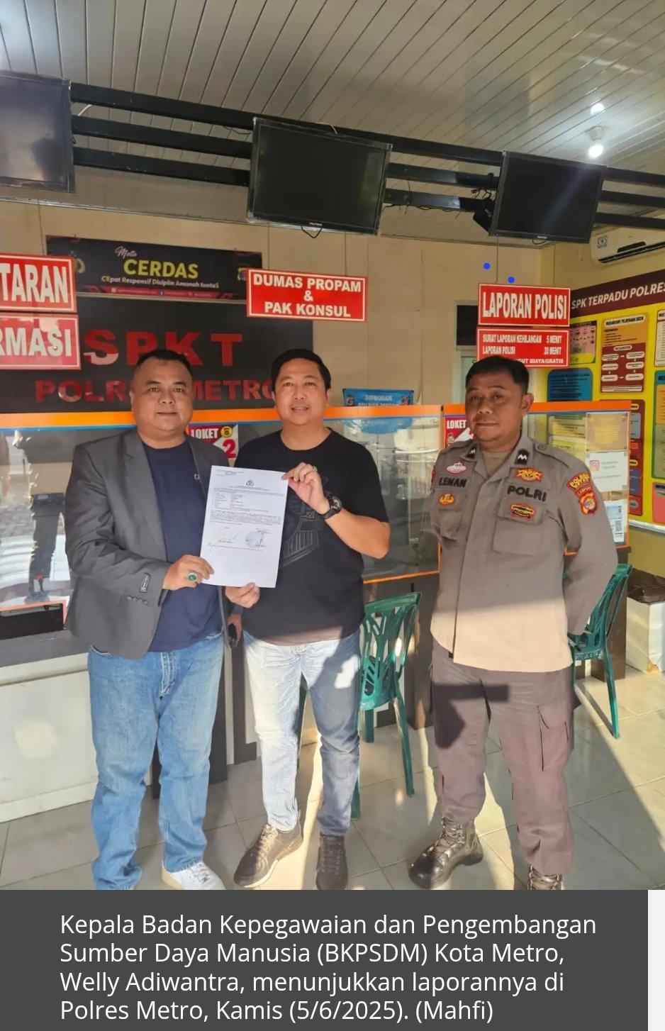 Suaraexpose—METRO, Kepala Badan Kepegawaian dan Pengembangan Sumber Daya Manusia (BKPSDM) Kota Metro, Welly Adiwantra, resmi melaporkan dugaan pencemaran nama baik ke Polres Metro. Laporan tersebut terkait dengan berita bohong (hoaks) yang mencatut namanya dalam kasus pemalsuan Surat Keputusan (SK) dan rekrutmen tenaga honorer di lingkungan Pemerintah Kota (Pemkot) Metro.