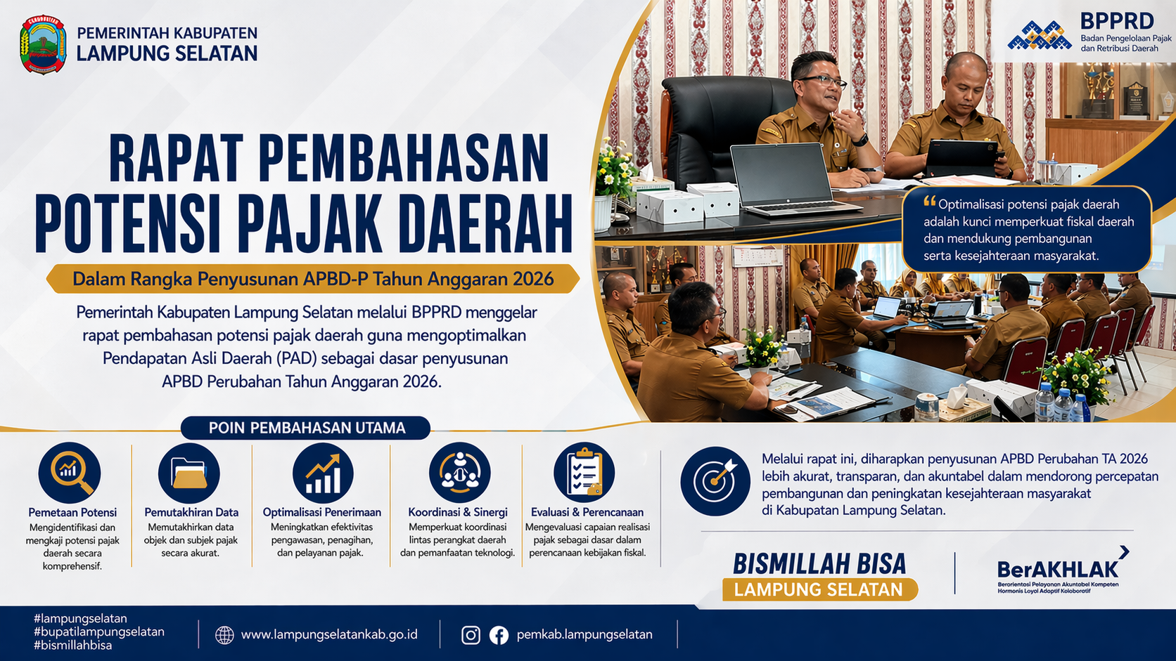 Lampung Selatan — Suaraexpose.com, Pemerintah Kabupaten Lampung Selatan melalui Badan Pengelolaan Pajak dan Retribusi Daerah (BPPRD) menggelar rapat pembahasan potensi pajak daerah dalam rangka penyusunan Anggaran Pendapatan dan Belanja Daerah Perubahan (APBD-P) Tahun Anggaran 2026.