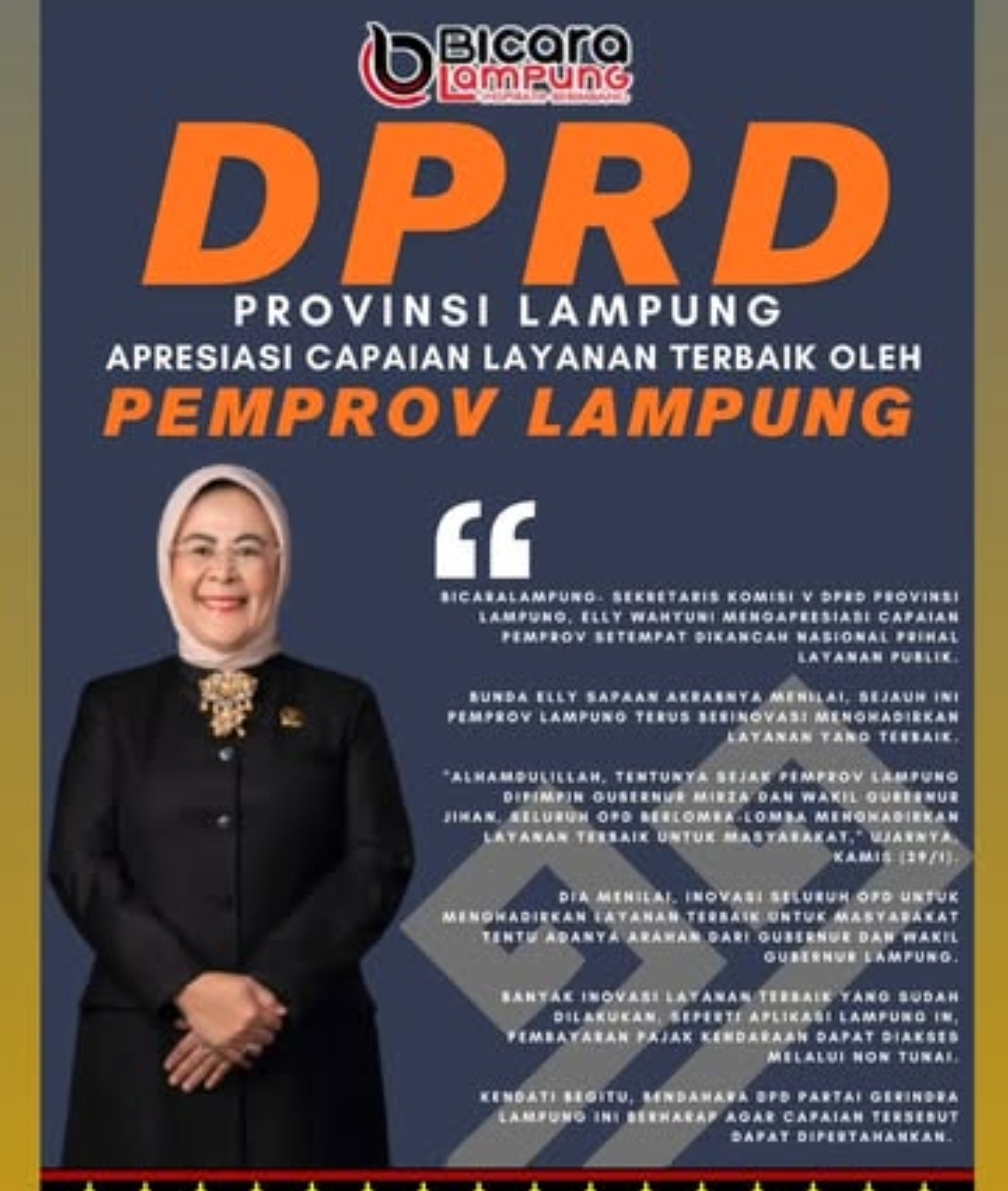 Bandar Lampung — Suaraexpose.com, Sekretaris Komisi V DPRD Provinsi Lampung, Elly Wahyuni, menyampaikan apresiasi terhadap capaian Pemerintah Provinsi Lampung yang berhasil meraih pengakuan di tingkat nasional dalam bidang pelayanan publik.