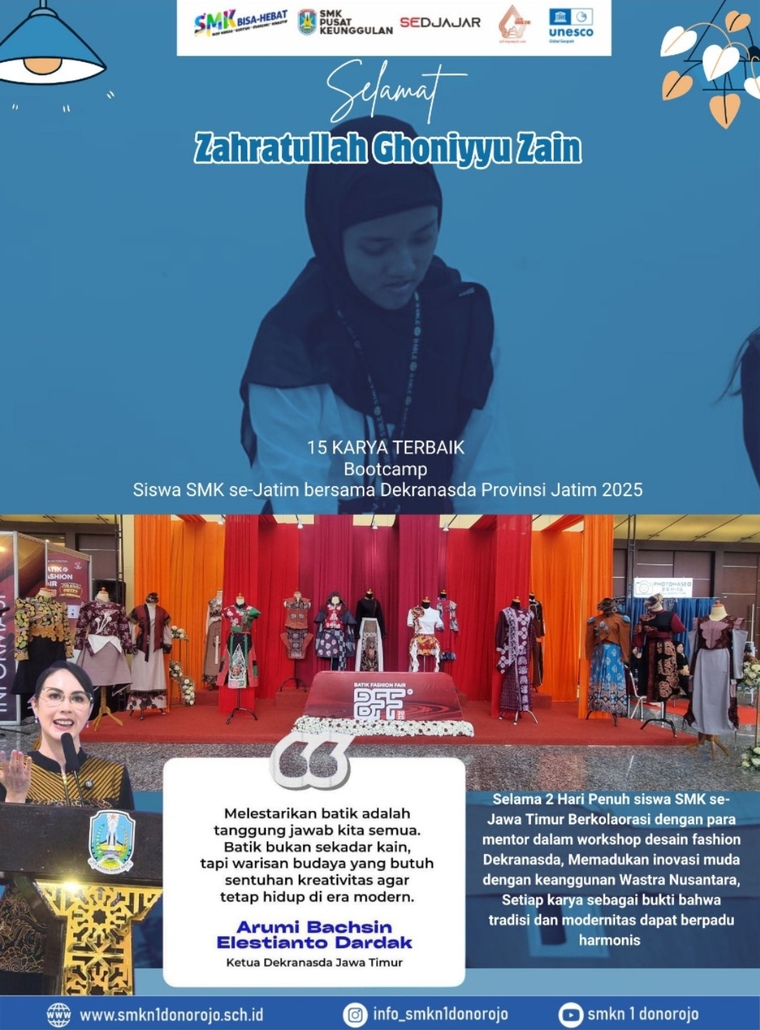 Melalui keikutsertaan ini, SMKN 1 Donorojo menunjukkan komitmennya dalam mencetak talenta yang siap bersaing dan memajukan kekayaan wastra Jawa Timur ke level yang lebih tinggi. (eko)